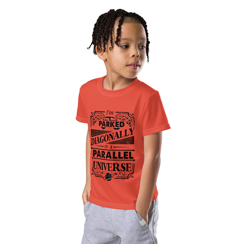 I'm parked diagonally in a parallel universe orange red kids crew neck t-shirt